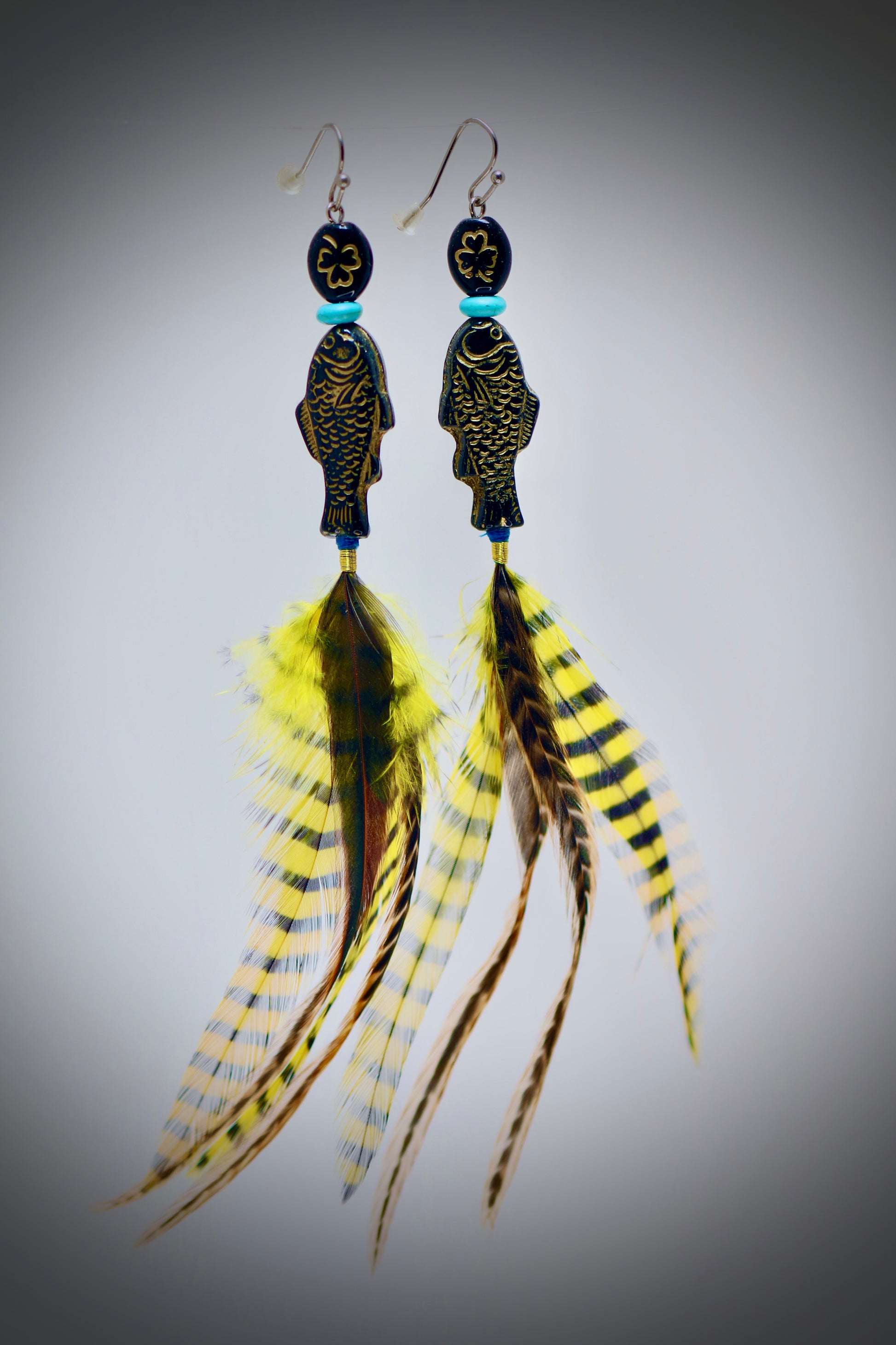 Vintage black and gold engraved clover and fish beads mixed with funky, long dyed chicken feathers.